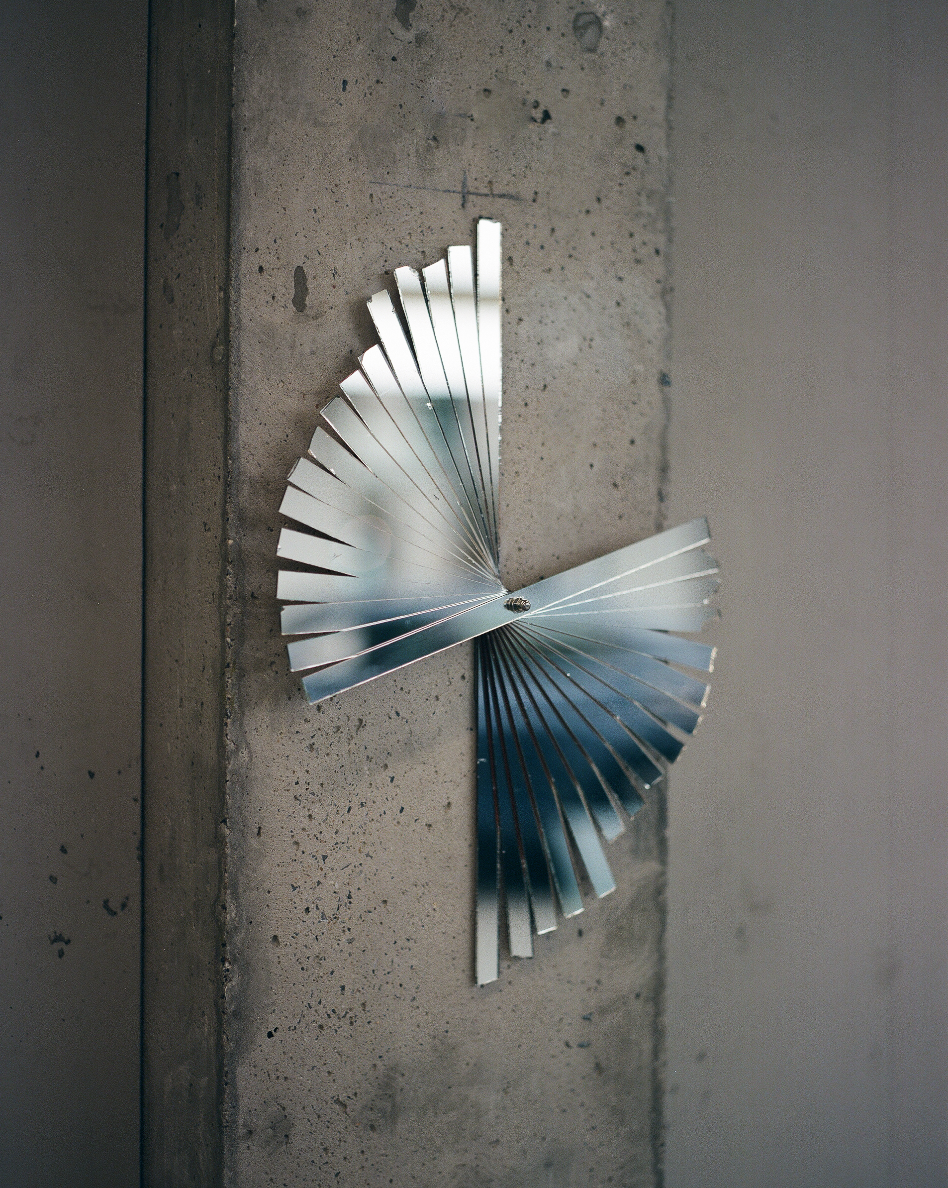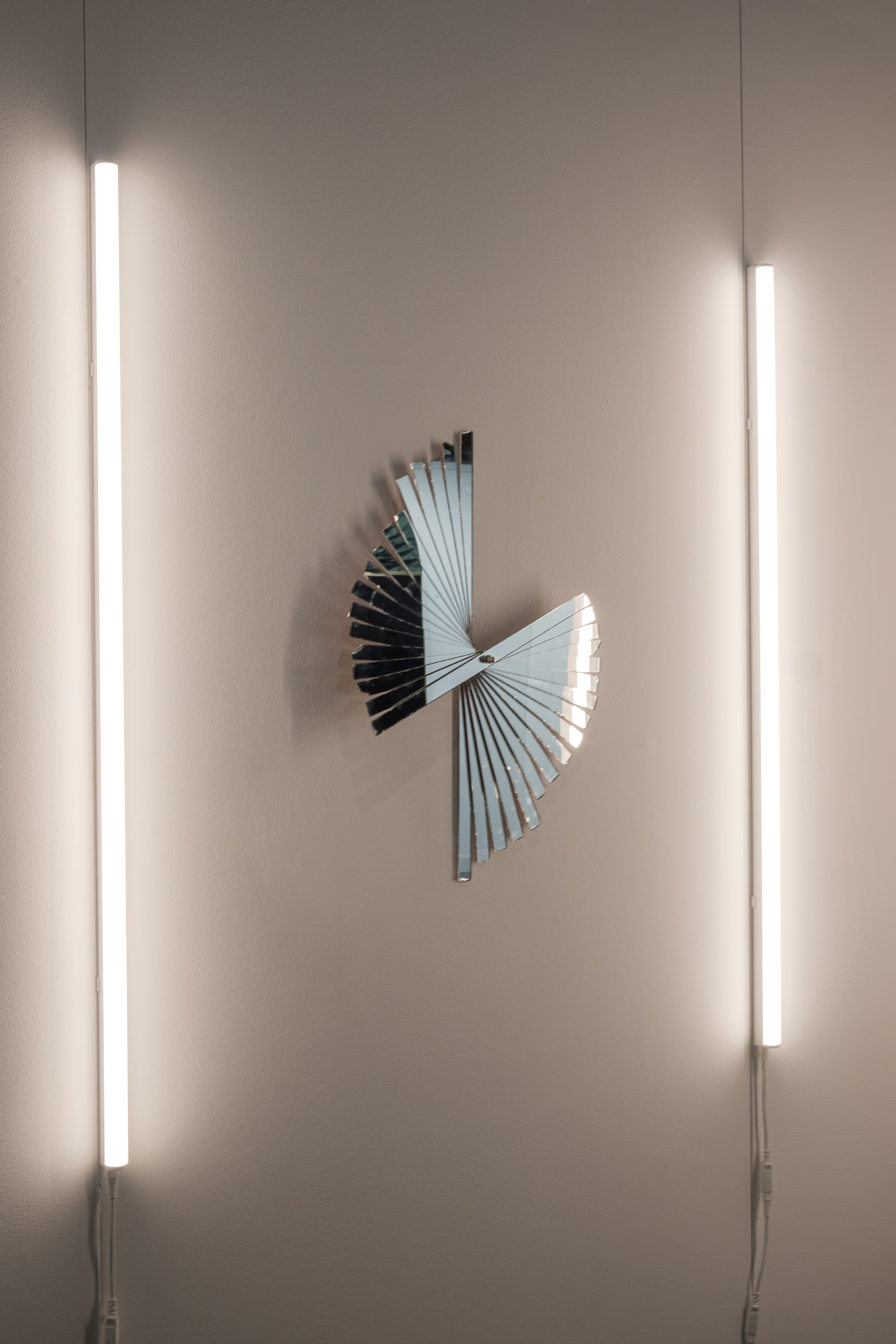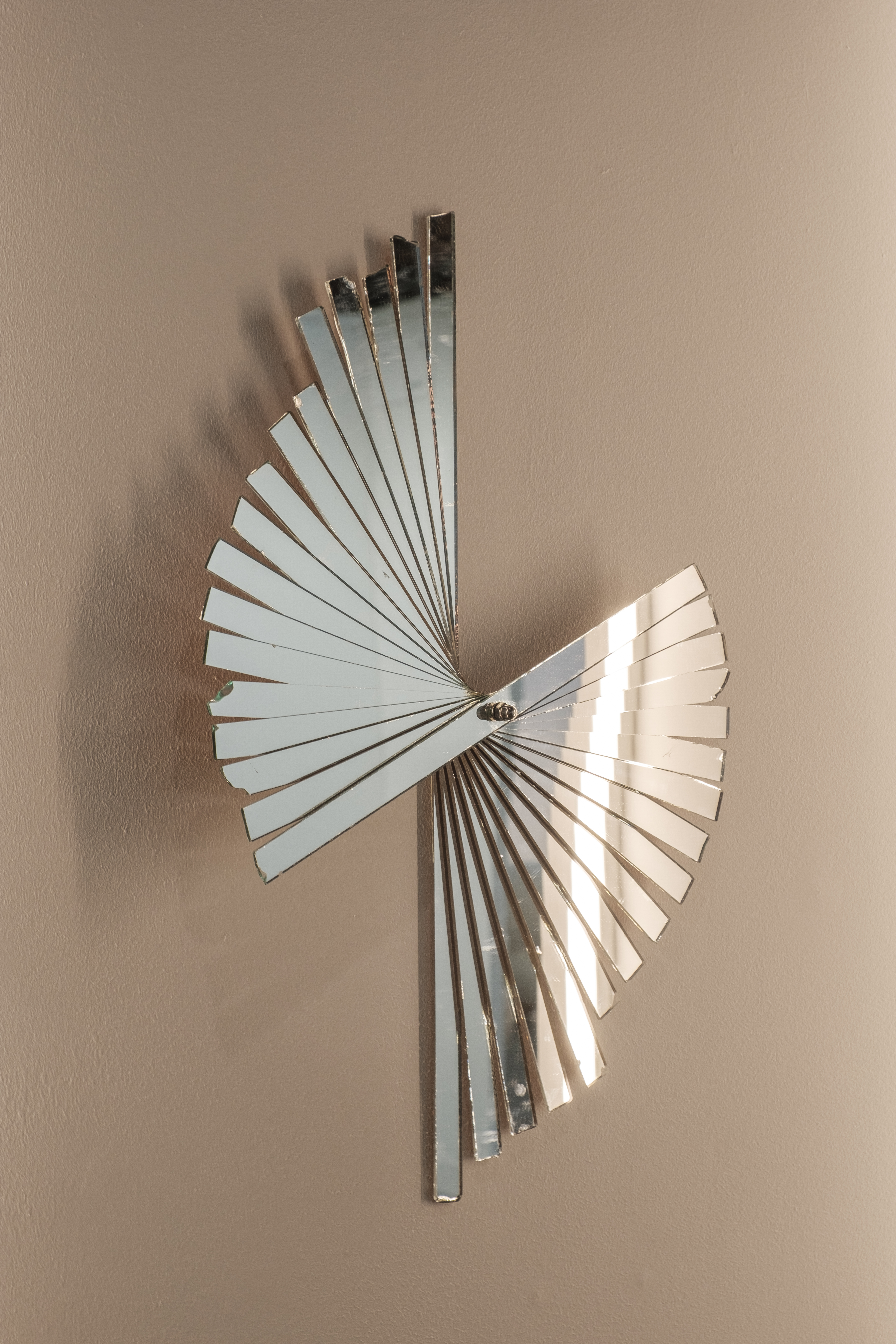Made entirely out of broken slats of mirrors, it is a wall mirror that can be manipulated by the user to create different designs and patterns. The slats are placed on top of each other and can be turned, allowing for endless possibilities of mirror configurations.